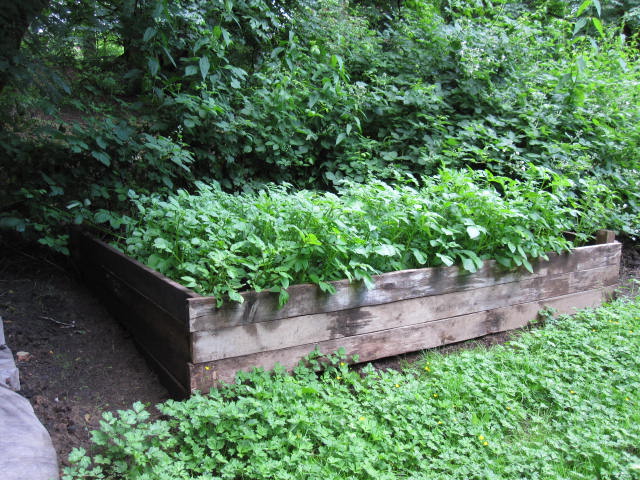 This year, we took the pile and built a raised bed around it with some old wood we had. The potatoes are growing and happy! Can’t wait for the potato crop this fall!