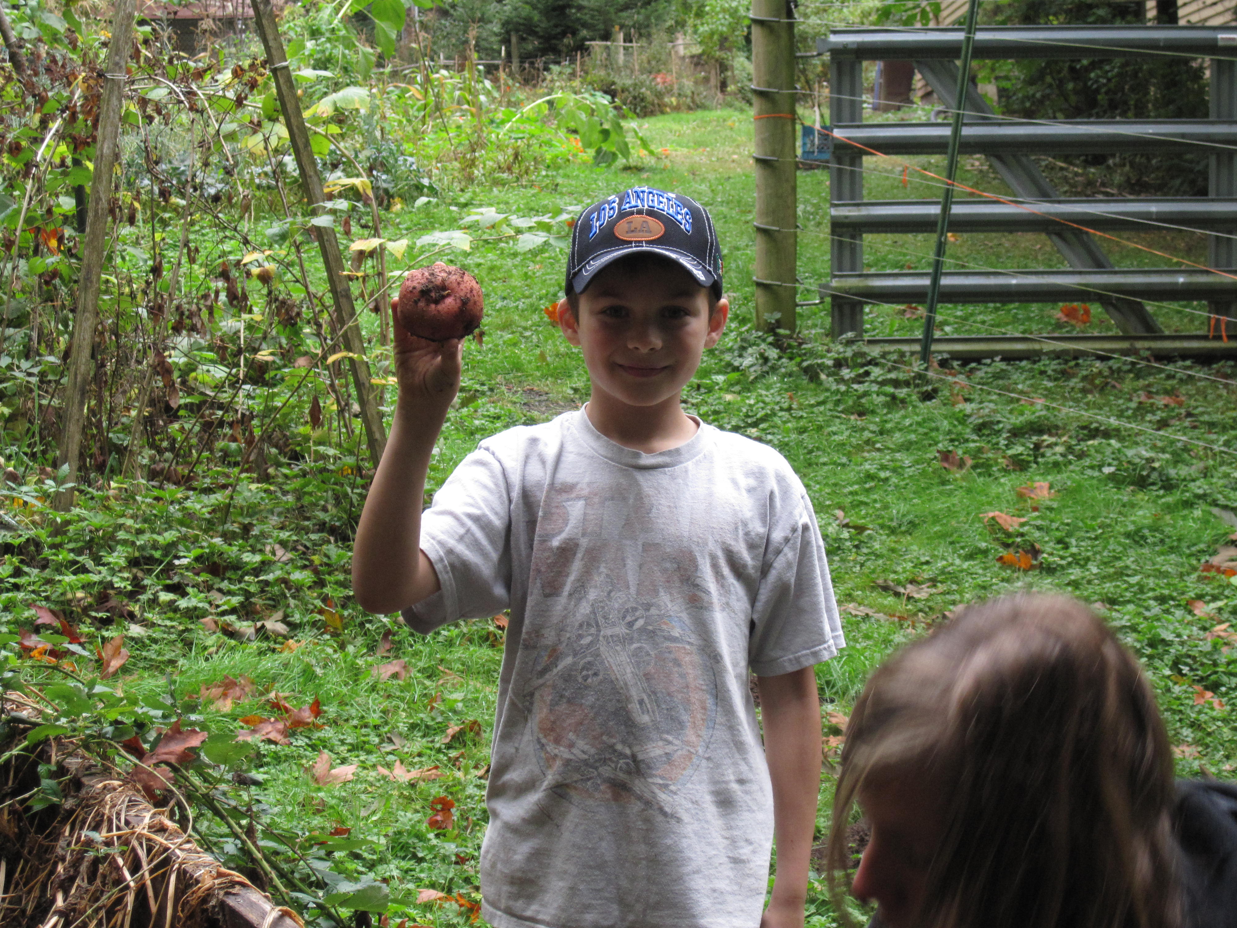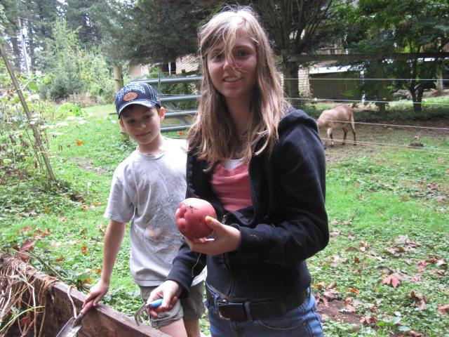 Well, our raised potato bed did us good! We harvested three grocery bags full of potatoes! Yum! The process is a bit like digging for gold and ended up being more fun then the kids thought it would be. We celebrated with our first batch of homegrown potato cheese soup this week, both our potatoes and our goat milk. Perfect for the cooler, rainy fall weather that is finally upon us.
