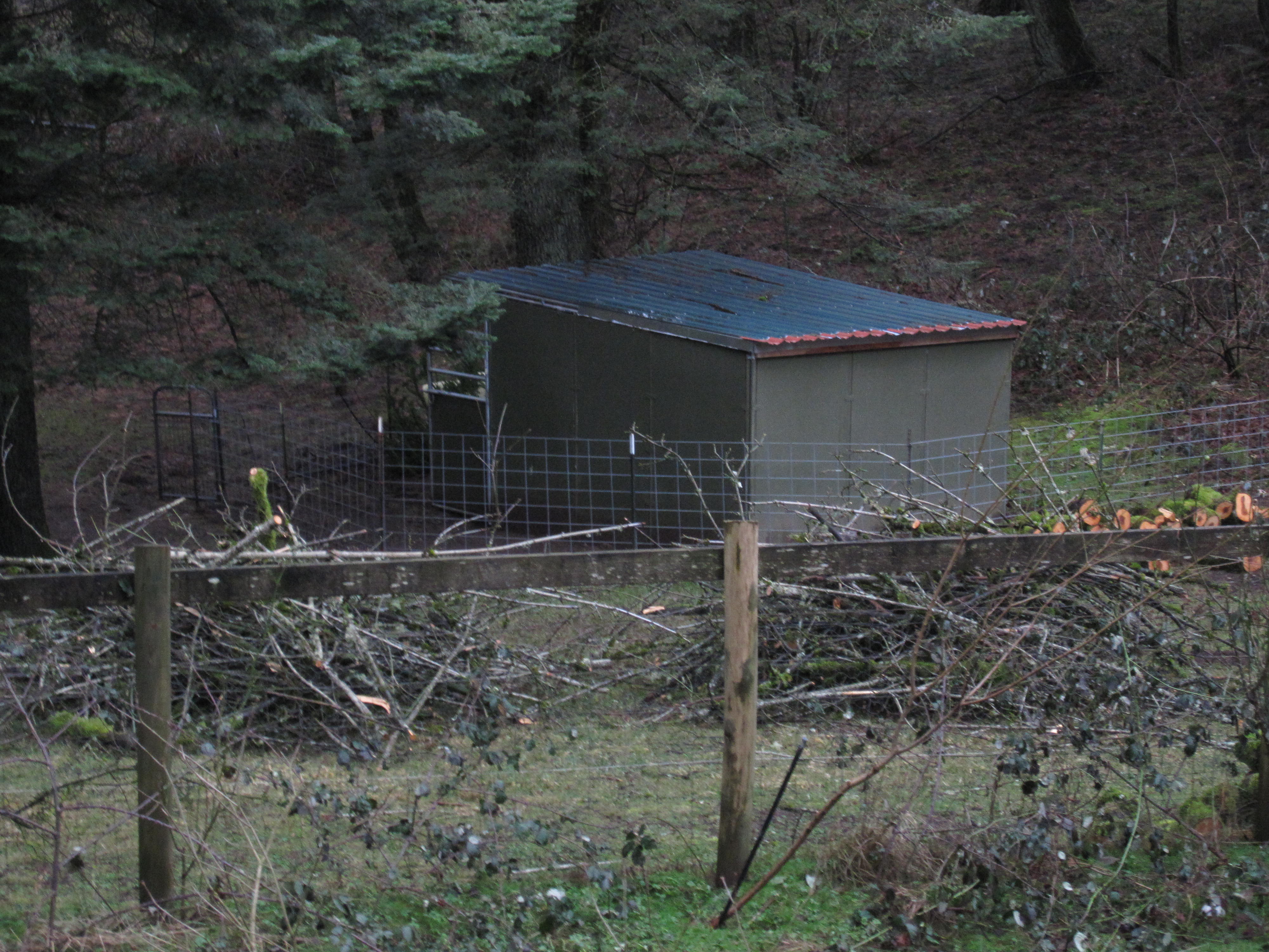 We have part of our tree cleanup completed. Enough that we were also able to fix the fence and let the goats back out in their pasture again. It took some strong backs and our neighbor with a chainsaw to get the job done.