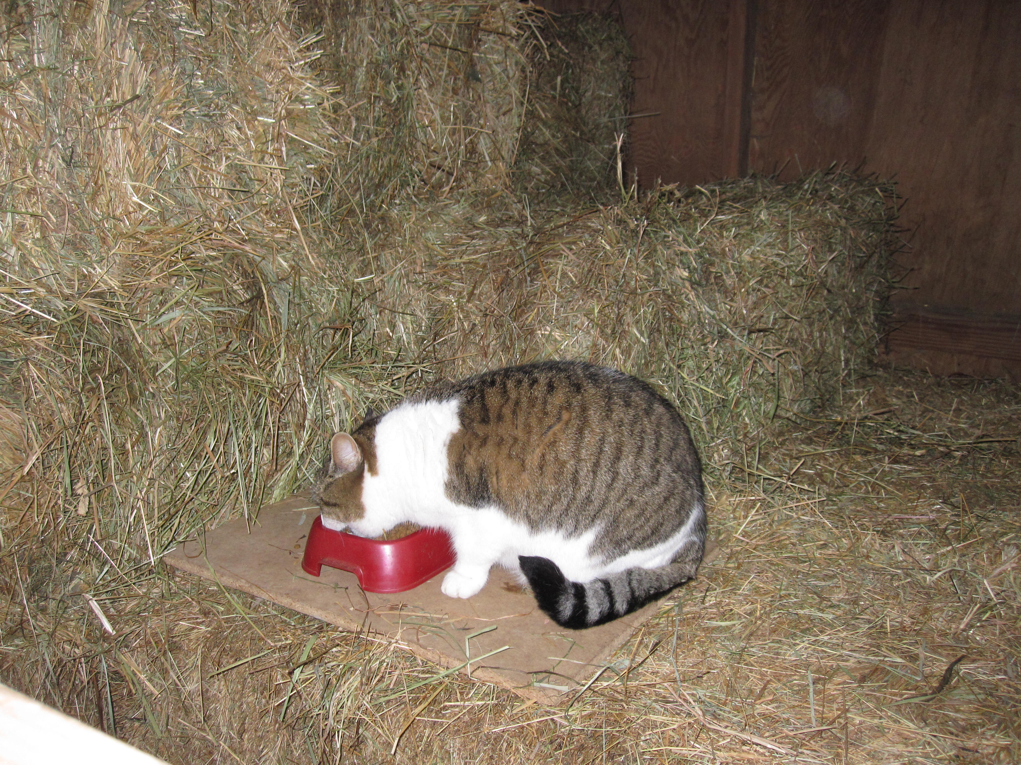 However, they love the barn. They love to sleep in the hay. And the barn is where I feed them. I actually put their food on top of the tall hay stacks to keep the dog from eating it. Works well as they enjoy climbing the hay bales and the dog can’t follow. Although… it has created an interesting dilemma.